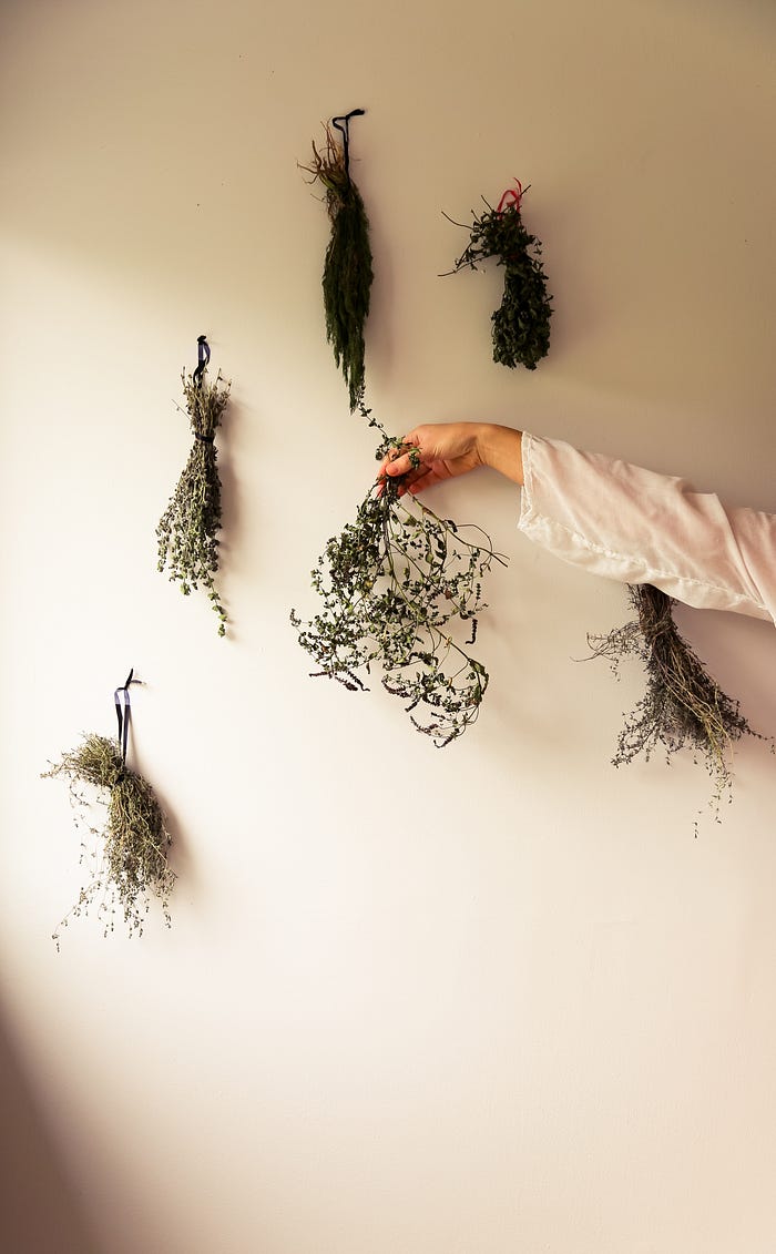 To dry herb leaves like basil, thyme, and oregano, tie small branches and sprigs into little bundles using string or twist-ties. Place the bundles in muslin bags or paper bags with air holes cut in them and tie the bag closed. Hang the bag somewhere cool, dark, and dry, checking on them periodically to determine when they’ve dried completely.